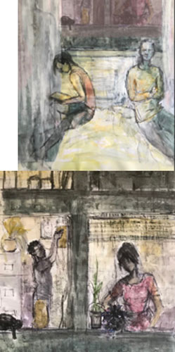 Lockdown for all its disadvantages and sorrow has also been a source of new ideas and change for lots of artists. A lot of creativity has been inspired by lockdown themes. Artists have been drawing and painting the masked population exercising in the park; travelling on public transport; sitting two metres apart (hopefully) in cafes and bars; zooming their friends or colleagues to chat. Art classes have gone online. I was doing a course at City Lit on portrait and life drawing when the first lockdown was imposed. The course had to go online for just over a term and instead of drawing and painting from models we had to use stuff we had already done combined with any ideas or inspiration we could get from the environment at home. The results were really interesting. People were combining their art work with emotions and fantasies; expressing their feelings about the effects of the lockdown.